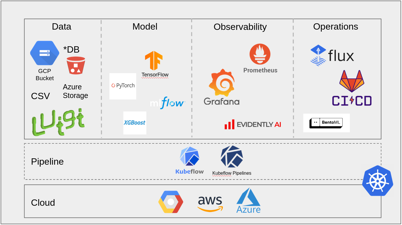 Nevertheless, this brought us one step closer to our decision. So why not just use Kubeflow Pipelines directly? With Kubeflow Pipelines, you can easily define your pipelines and deploy them directly on a Kubeflow cluster. Kubeflow itself is based directly on the Kubernetes stack and therefore runs cloud-agnostic. For this solution, we needed a little more customization and configuration to wire the components. However, this also gave us direct influence on the functionality we needed for our pipeline. In the end, we started to build our own MLOps framework/blueprint based on Kubeflow pipelines. Now we have full control over the functionality and can react more easily in case of problems.